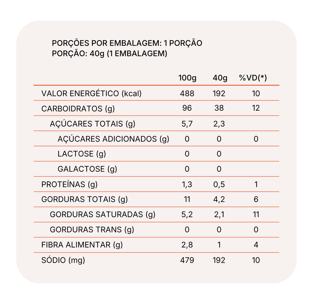 Polvilho azedo, batata doce, beterraba, gordura de palma, linhaça, alho poró, salsinha, cebolinha e sal.