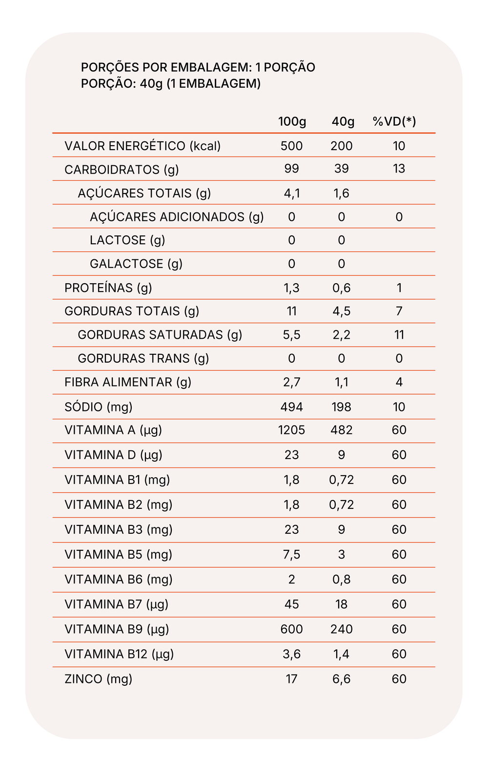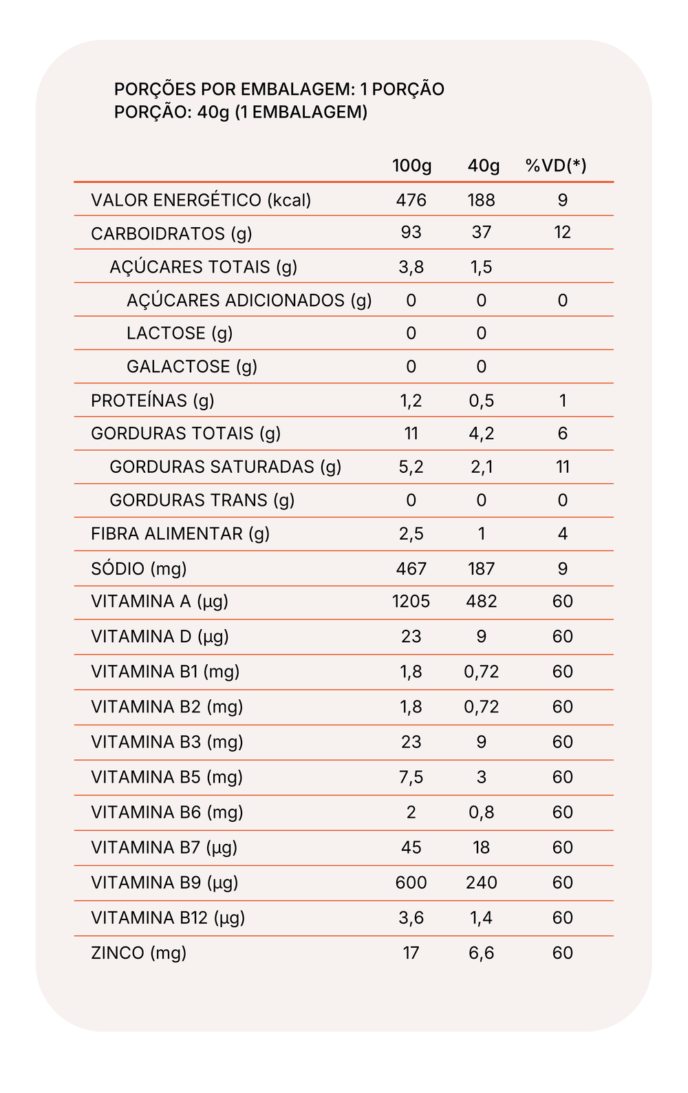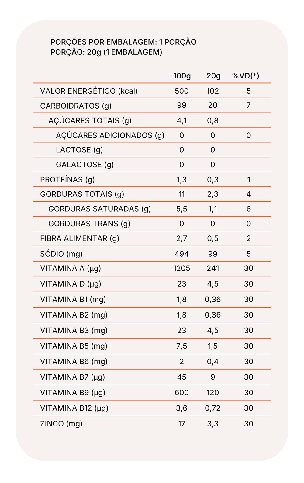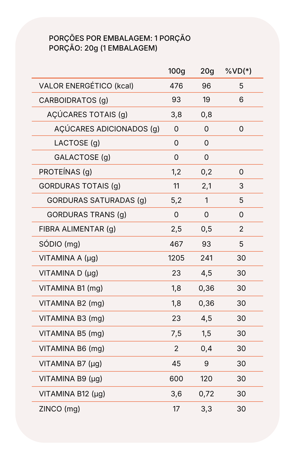 SOPINHA DE LEGUMES: Polvilho azedo, batata doce in natura, abobrinha in natura, gordura de palma, cenoura in natura, tomate in natura, cebola in natura, alho poró in natura, sal, louro, mix de vitaminas (vitamina A (acetato de retinol), vitamina D (ergocalciferol), vitamina B1(tiamina), vitamina B2 (riboflavina), vitamina B3 (niacina), vitamina B5 (ácido pantotênico), vitamina B6 (piridoxina), vitamina B7 (biotina), vitamina B9 (ácido fólico), Vitamina B12 (cianocobalamina) e Mineral (Zinco (sulfato de zinco). NÃO CONTÉM GLÚTEN.